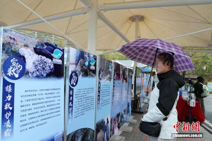 图为游客观看展板了解雪豹救护过程。