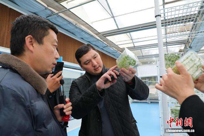 图为10月21日,哈萨克斯坦阿拉木图州副州长巴基图雷·巴克特努尔(左二)了解互助县国家现代农业产业园培育的马铃薯脱毒苗。