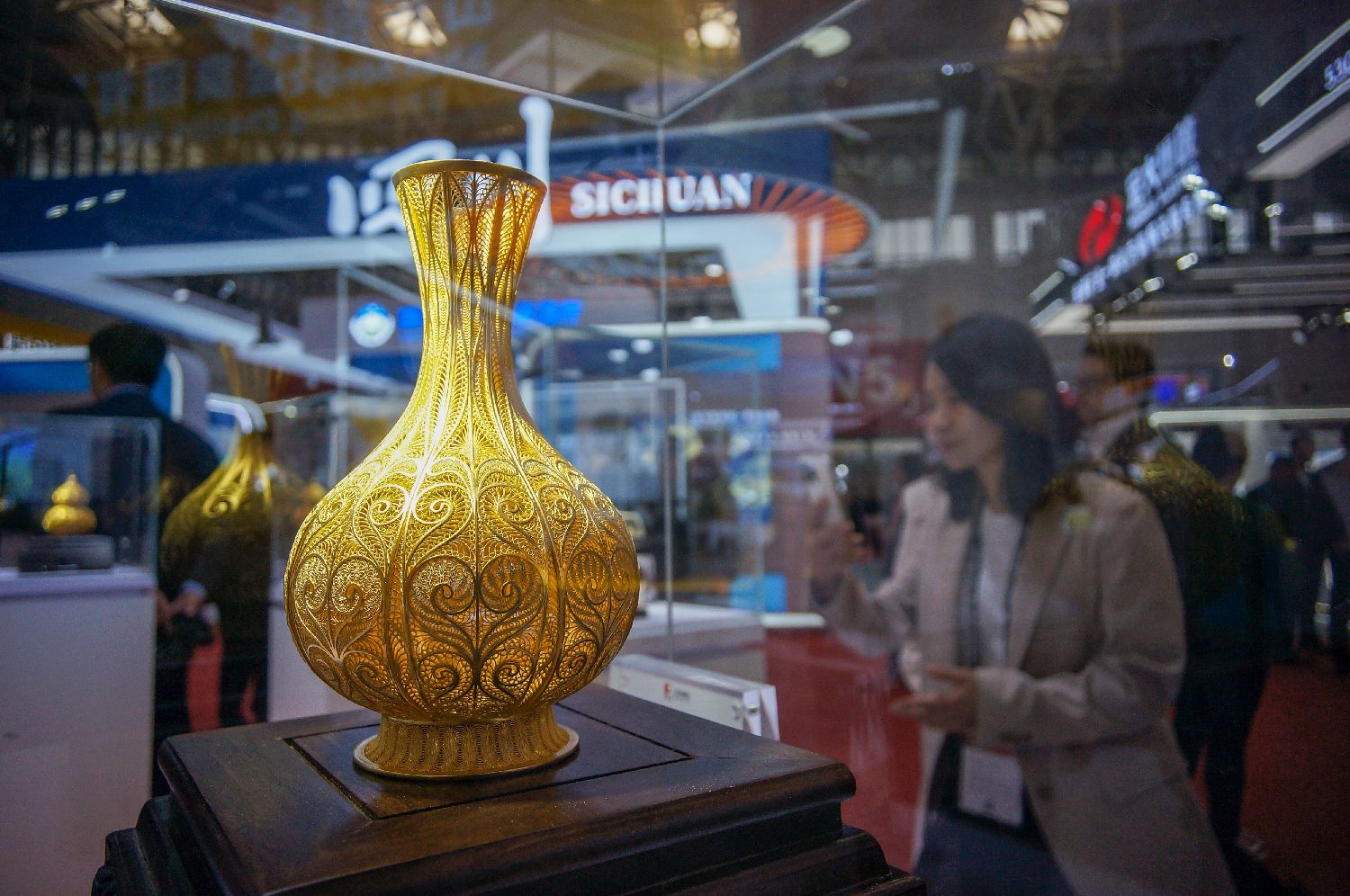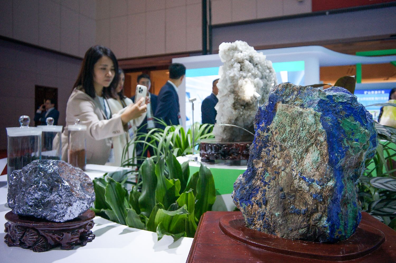 大会以“互融互通,共建共享”为主题,设置了智能矿山(智能制造)、地质调查/矿业勘探设备、重型机械设备及配套零配件等多个展区,涵盖矿业全产业链条。图为10月23日,与会嘉宾参观花丝花瓶。