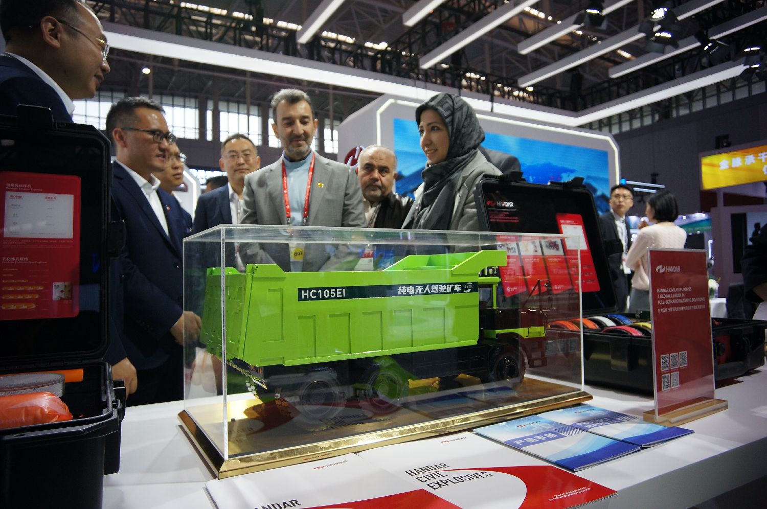 10月23日,与会嘉宾在展台了解纯电无人驾驶矿车。当日,2025第二十七届中国国际矿业大会在天津梅江会展中心举行。