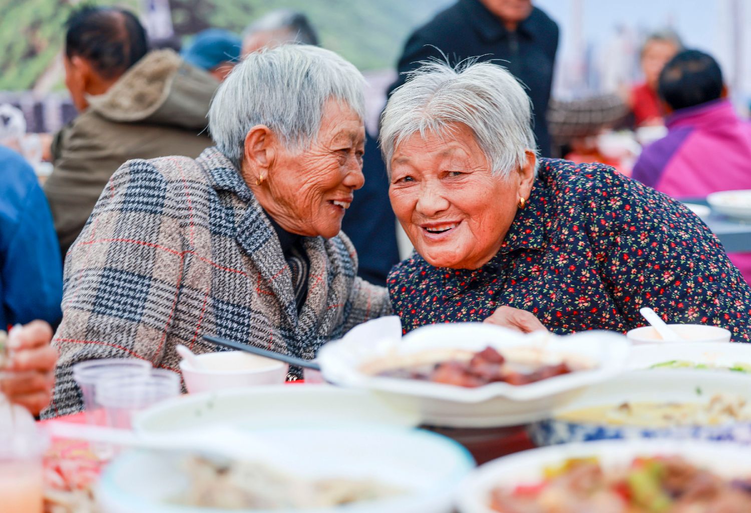 10月26日,江苏省泰州市姜堰区白米镇马沟村第三届重阳节“百寿宴”现场,两名老人在席间交流。(图片来源:本文图片均据新华社)