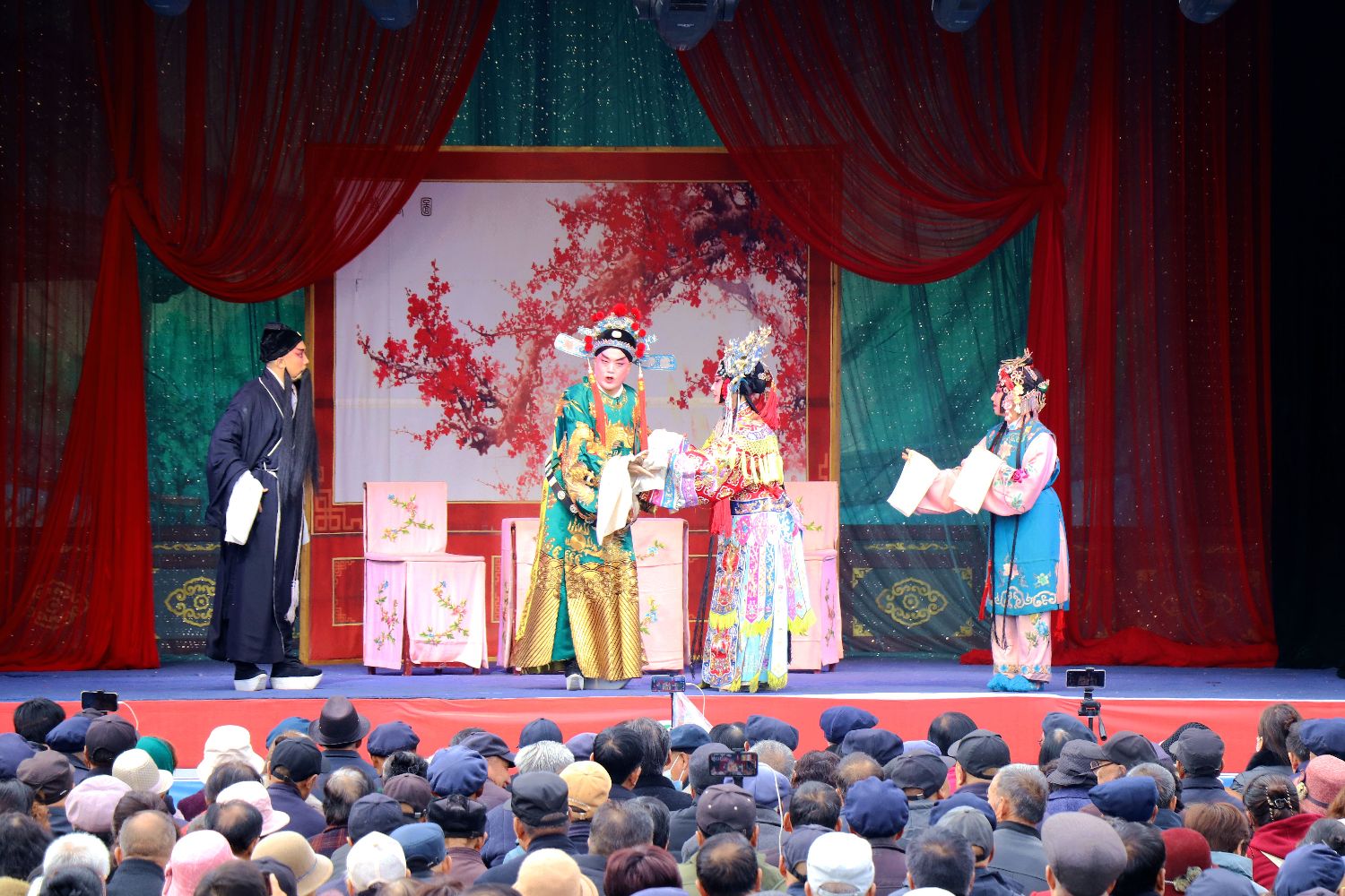 10月27日,在甘肃省平凉市静宁县体育场,群众观看来自陕西省戏曲研究院的演员表演秦腔。