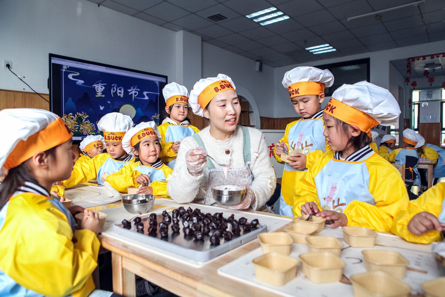 10月27日,在河南省焦作市博爱县县直幼儿园,老师指导小朋友在食育坊里制作重阳糕。