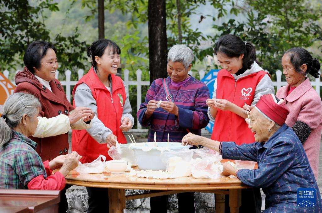10月27日,在贵州省黔东南苗族侗族自治州施秉县甘溪乡高碑村举办的“情暖重阳·敬老情长”活动中,志愿者与老人们一起包饺子。