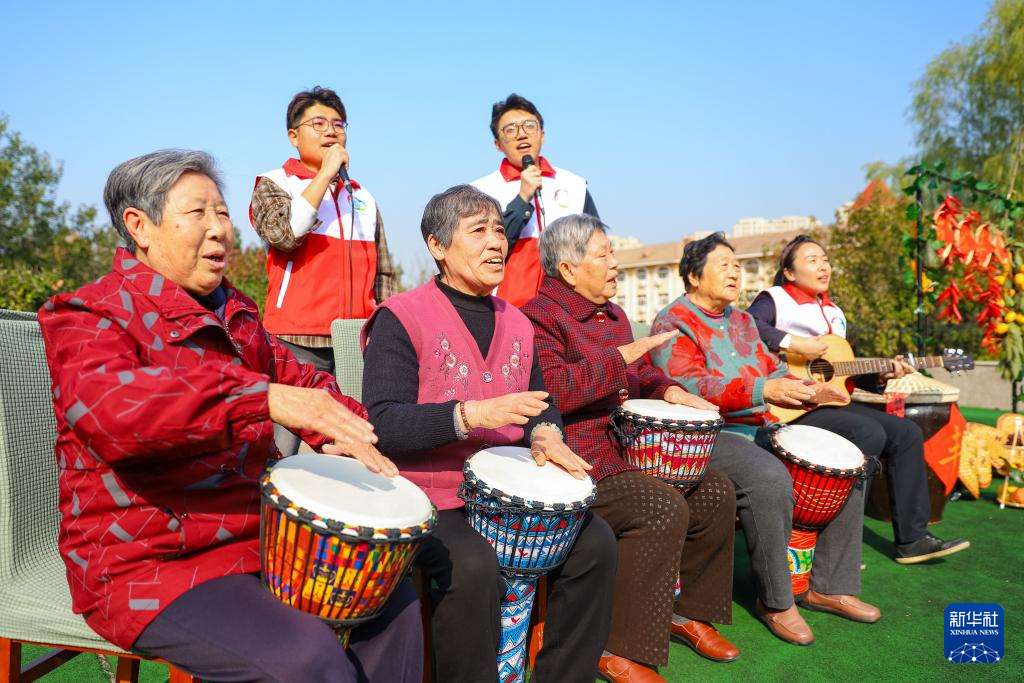 10月28日,在山东省青岛市李沧区社会福利院开展的“爱满重阳”主题活动中,志愿者和老人们一起表演节目。