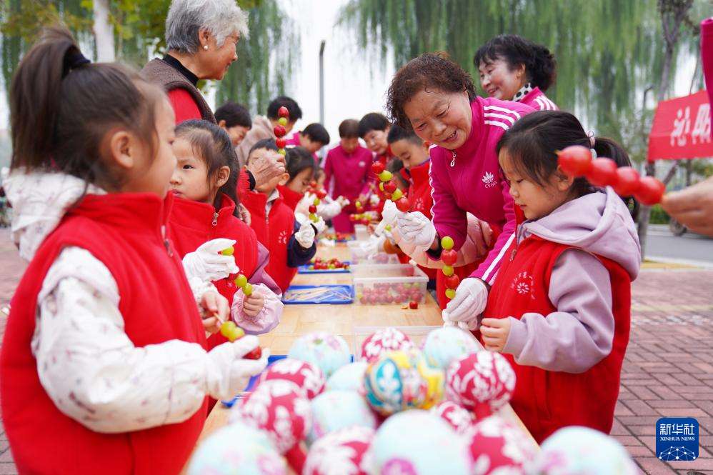 10月28日,河南省沁阳市第一幼儿园的孩子们与老人一起动手制作甜品。
