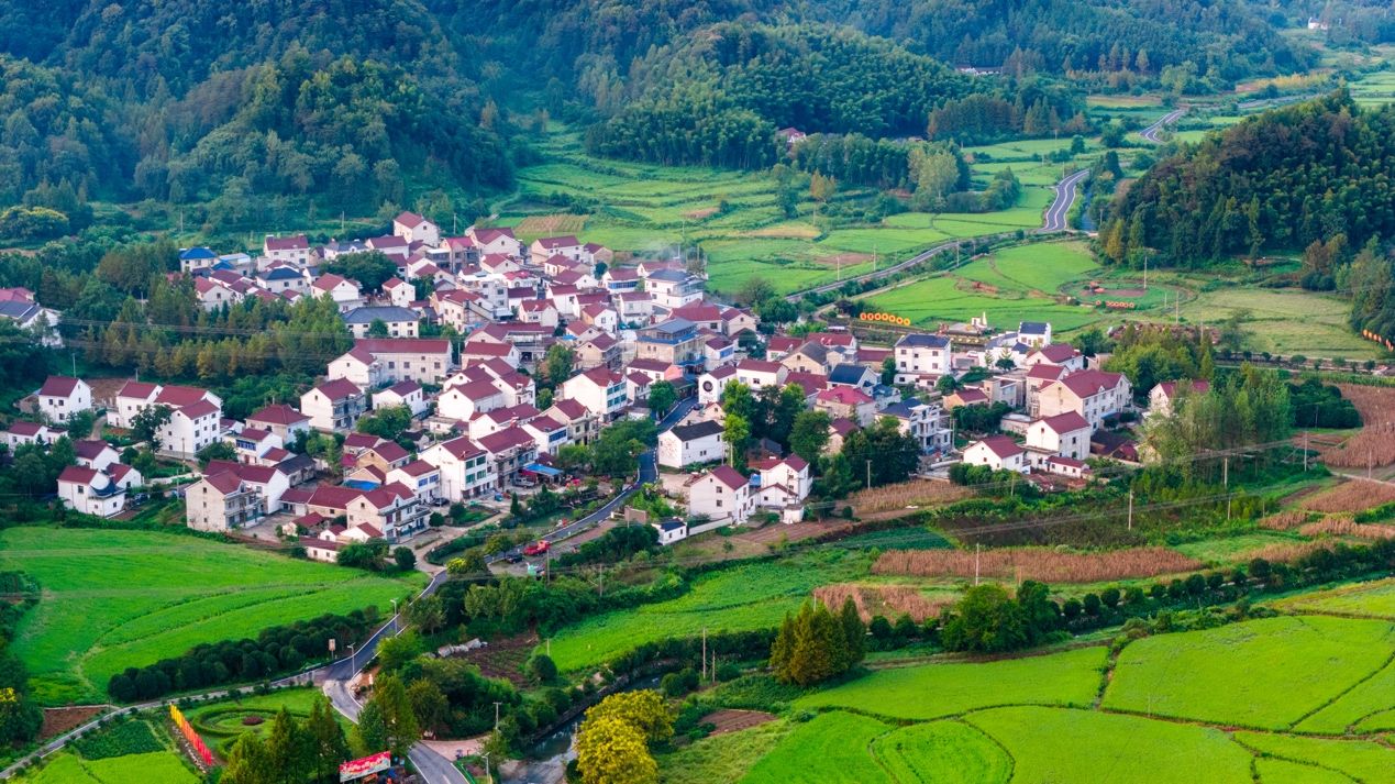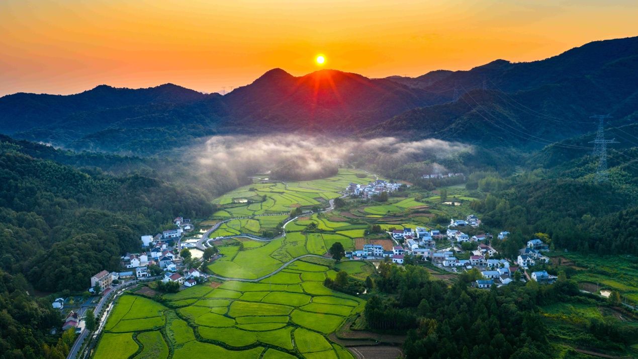 芜湖市南陵县烟墩镇霭里村,错落有致的村庄与田园、青山、道路交相辉映,构成一幅和美乡村画卷。(图片来源:储成胜 摄)