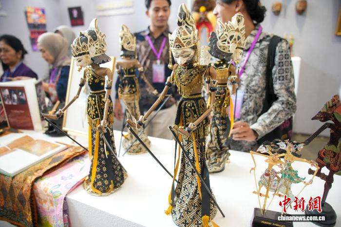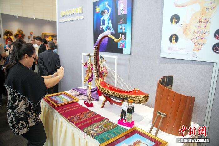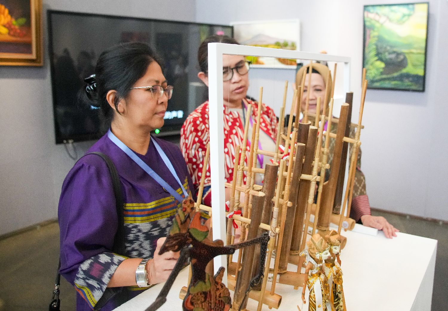 本次展览以“戏剧艺术”为核心主题,集中呈现中国与东盟国家上百件与戏剧相关的艺术精品,涵盖传统乐器、戏剧头盔、木偶道具等多个类别。图为演员在现场演奏印度尼西亚传统乐器“昂格隆”。(图片来源:中新社)
