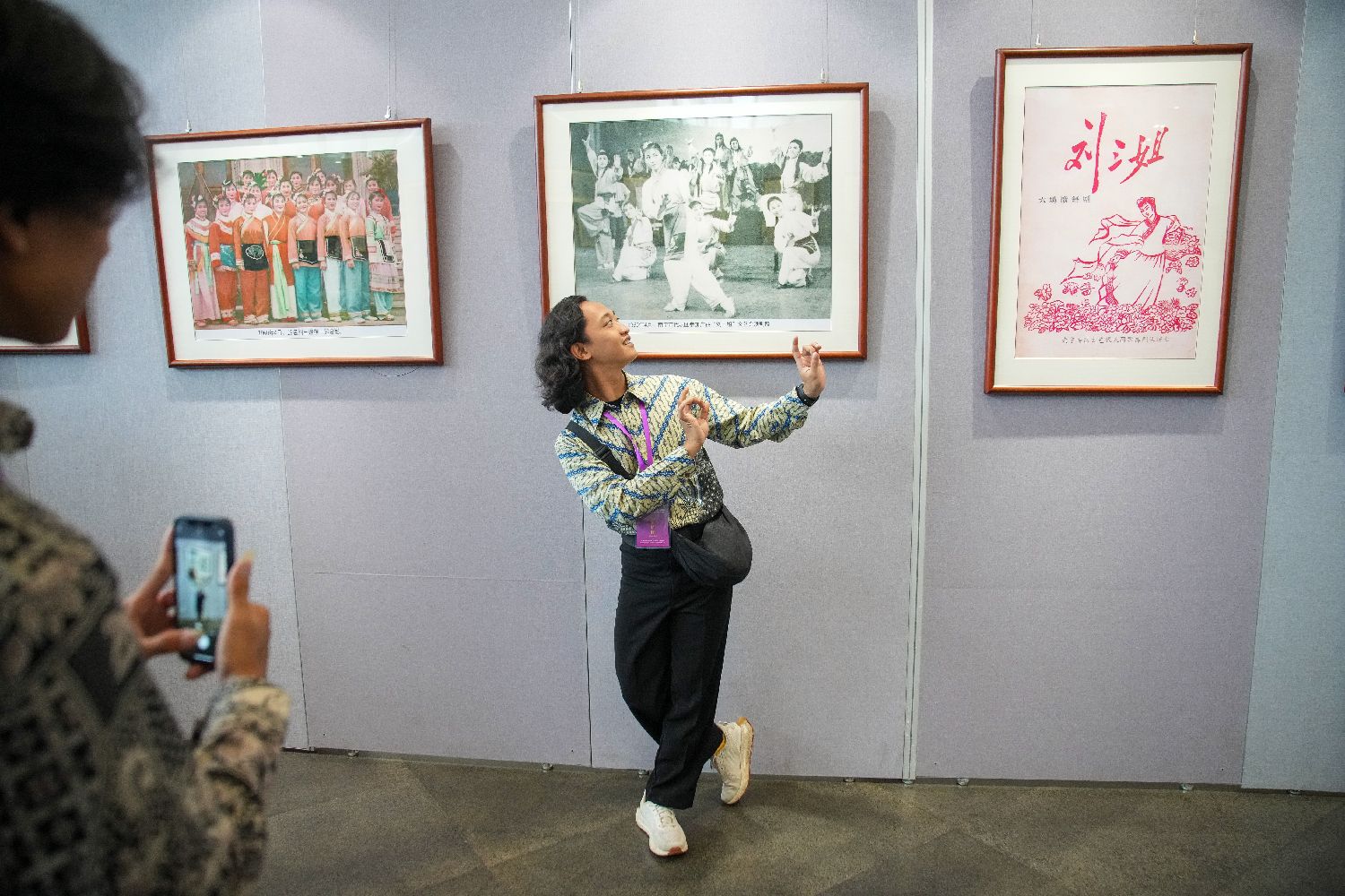 10月29日,印度尼西亚戏剧演员学习《刘三姐》剧照中的动作。当日,丝路华章——第十二届中国—东盟(南宁)戏剧周戏剧艺术展在广西南宁博物馆正式开展。(图片来源:中新社)