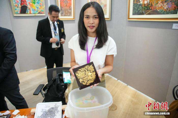 泰国艺术家展示自己在现场用金箔制作的画作。(图片来源:中新网)