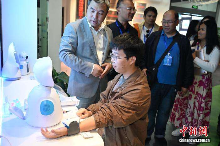 工作人员介绍中医健康机器人。