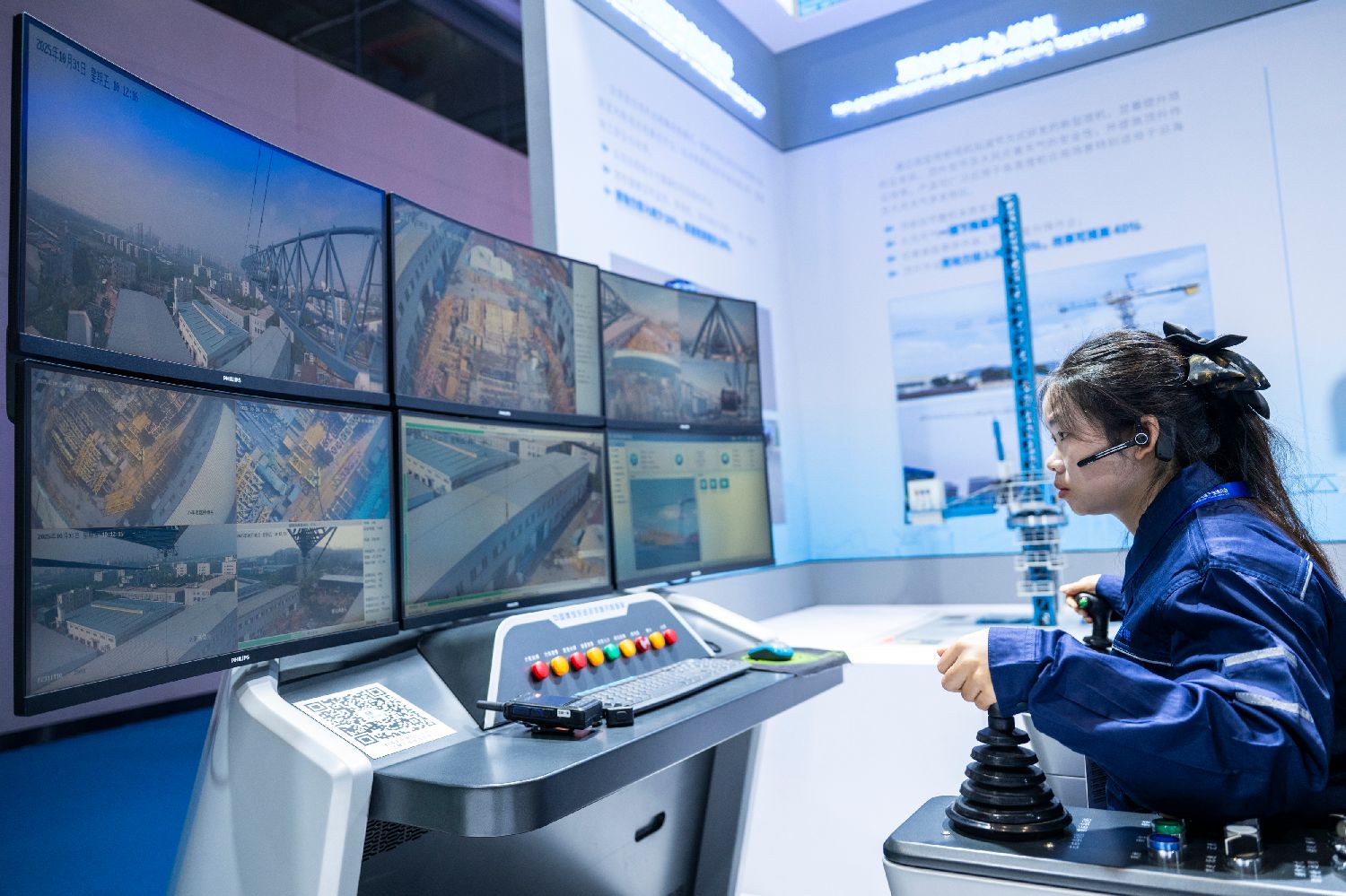 10月31日,在博览会现场,一名工作人员在展示塔机智能集控系统。