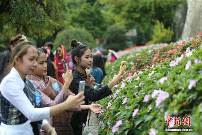 10月31日,三名留学生在大理古城拍摄花卉。