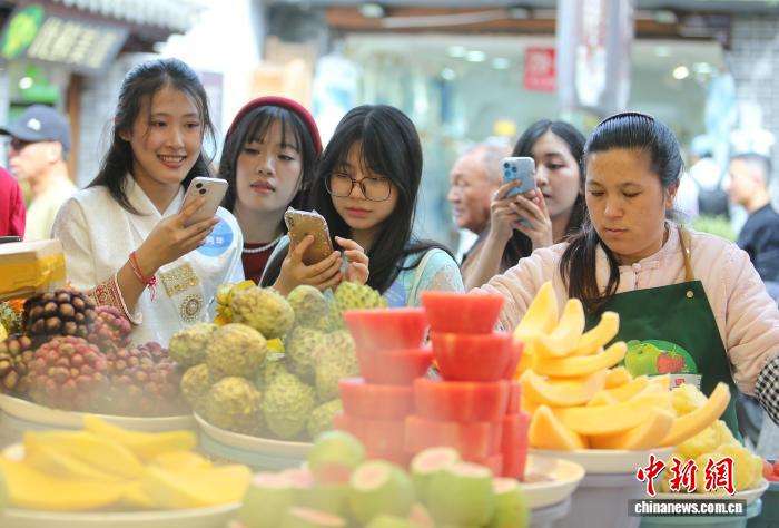 10月31日,同学们在大理古城拍摄琳琅满目的水果。
