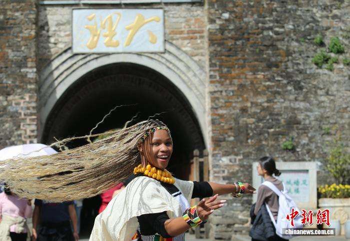 10月31日,一名留学生在大理古城翩翩起舞让同学进行拍摄。