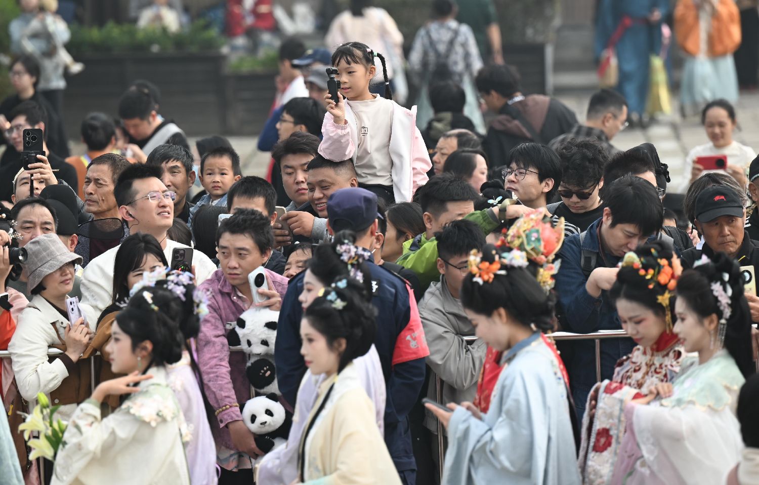 11月1日,即将登场的汉服方阵吸引小朋友。