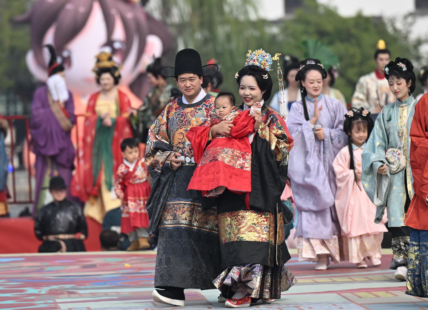 11月1日,家长带孩子参加亲子方阵汉服走秀。