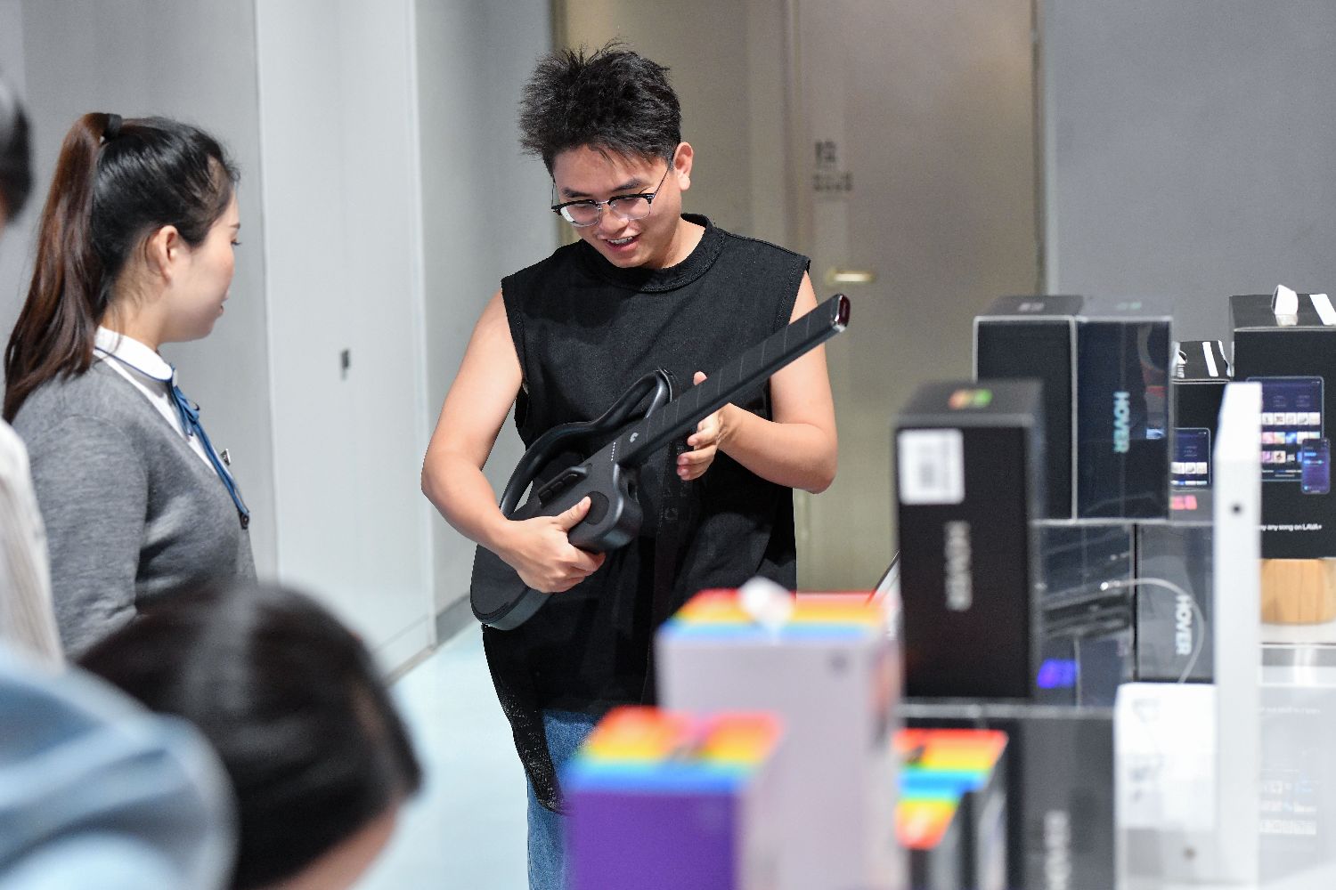 11月1日,顾客在cdf海口国际免税城体验无弦吉他。