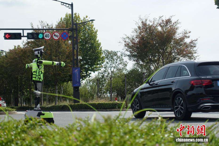 11月3日,机器人“交警”辅助指挥交通。当日,机器人“交警”在浙江桐乡乌镇上岗,该交通指挥机器人高1.8米,不仅可复刻各类指挥动作,更能与信号灯系统联动,实现动态分流与智能劝导。(图片来源:中新社)