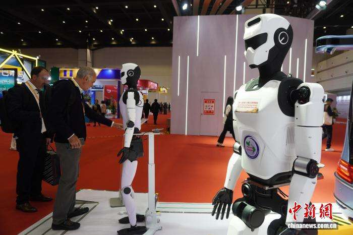 图为外宾参观展出的机器人。