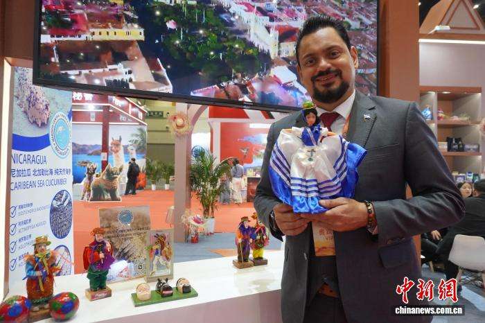 图为外宾展示尼加拉瓜传统手工艺品。