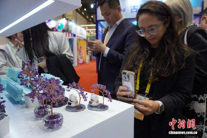 图为外宾参观展出的乌拉圭紫水晶产品。