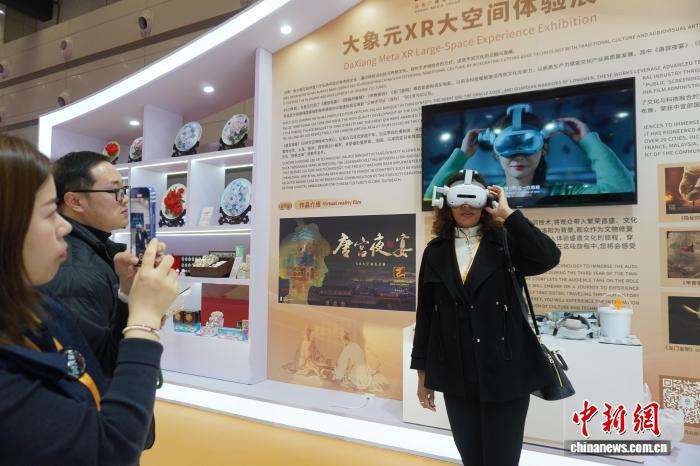 图为外宾体验唐宫夜宴XR大空间沉浸展。