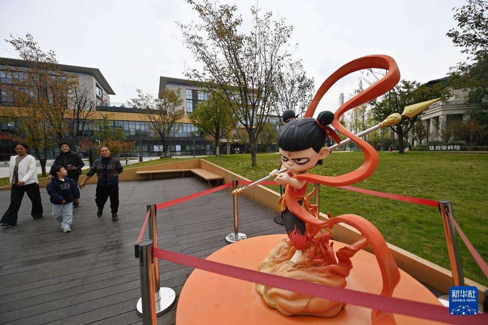 11月2日,人们从成都市天府长岛数字文创园的哪吒雕塑旁走过。天府长岛数字文创园是成都高新区围绕数字文创产业策划打造的专业园区。(图片来源:本文图片均据新华社)