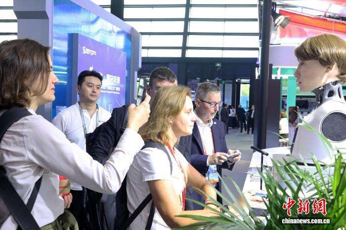 11月6日,国际友人与机器人进行互动。