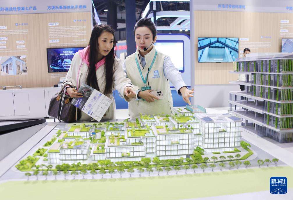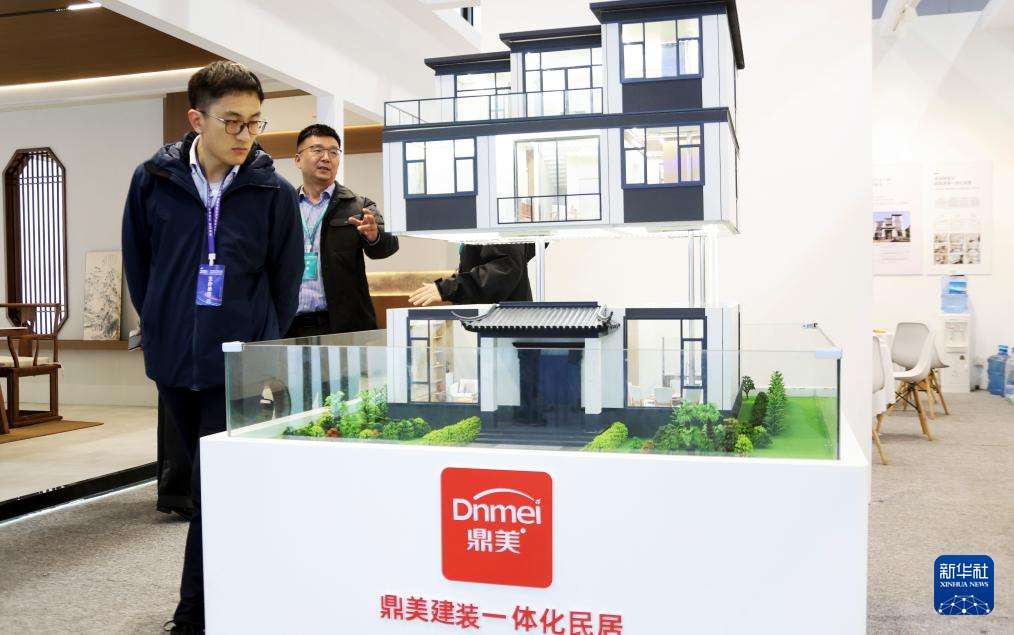 11月6日,参观者在住博会上观看展出的一体化民居模型。