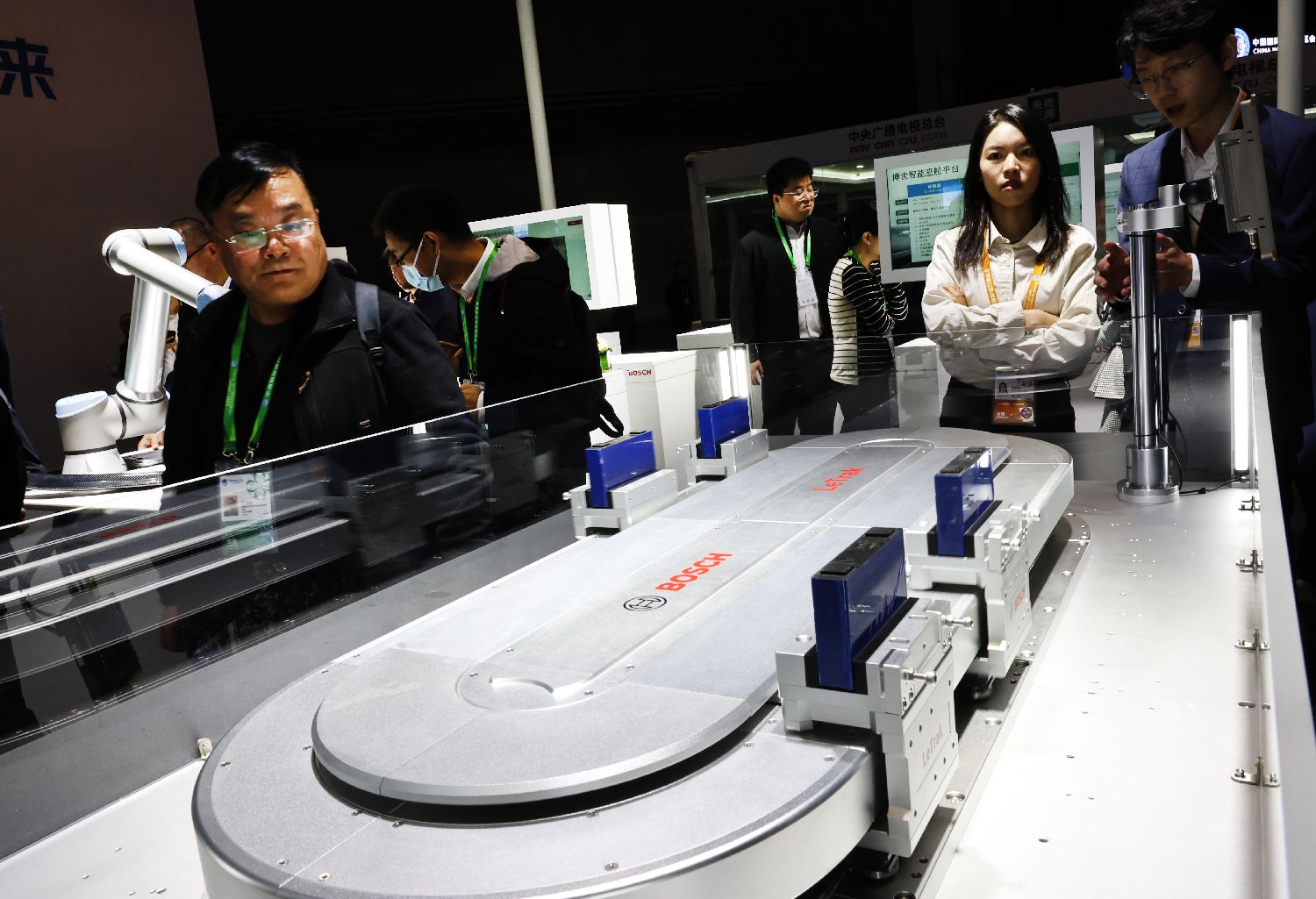 11月6日,参观者在博世公司展台展出的LeTrak磁驱传输系统展品旁驻足观看,这是该产品的全球首发。