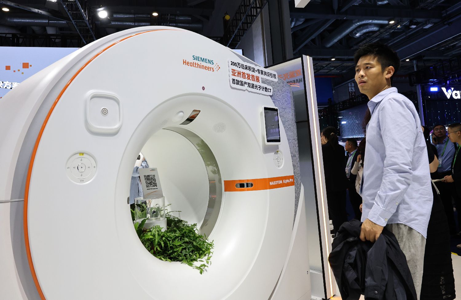 11月6日,参观者在西门子公司展台一个CT机展品旁驻足观看,这是西门子公司首款中国国产双源光子计数CT,也是该产品亚洲首发首展。