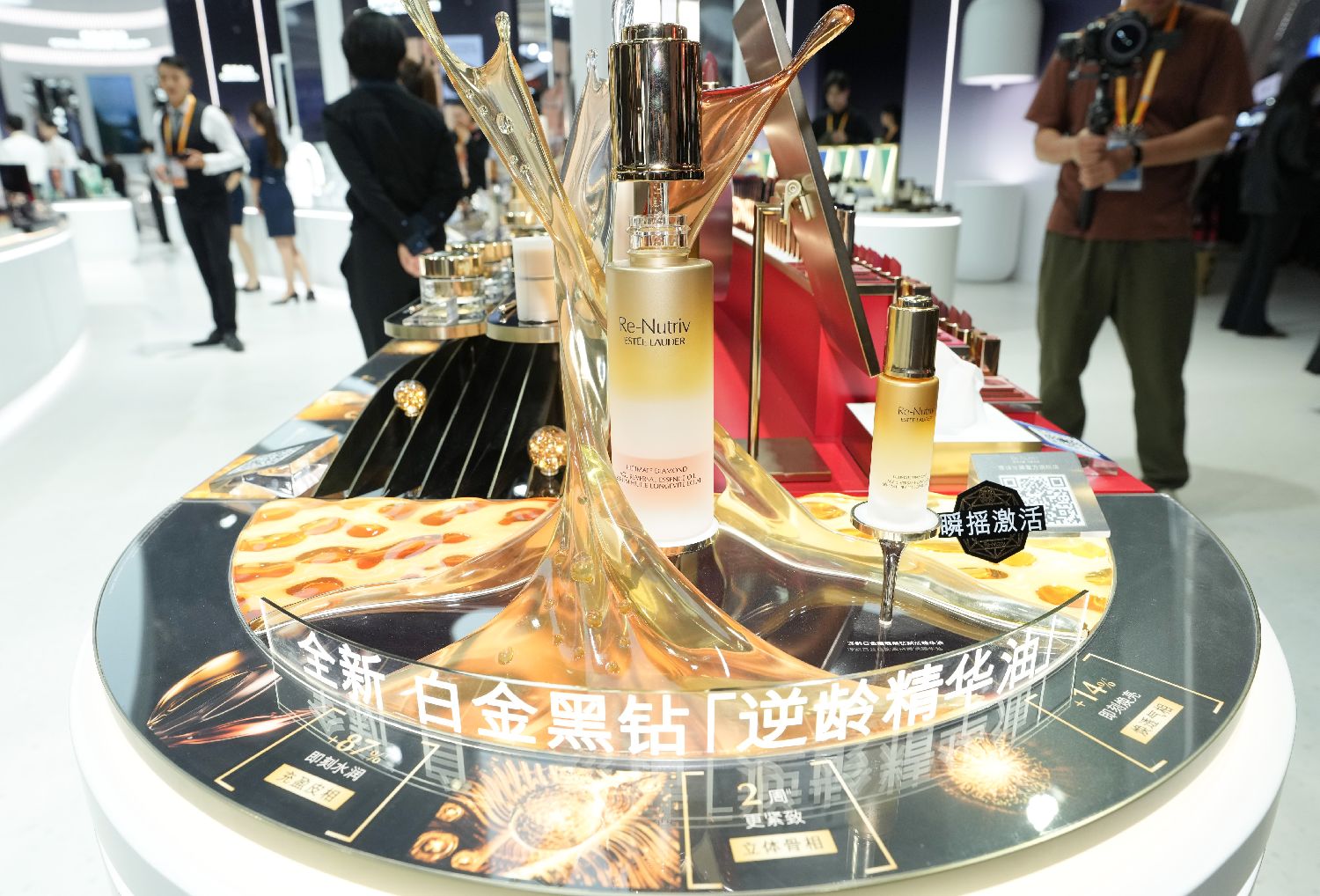 11月6日在进博会消费品展区拍摄的雅诗兰黛白金黑钻逆龄精华油。这是该产品在中国首发。