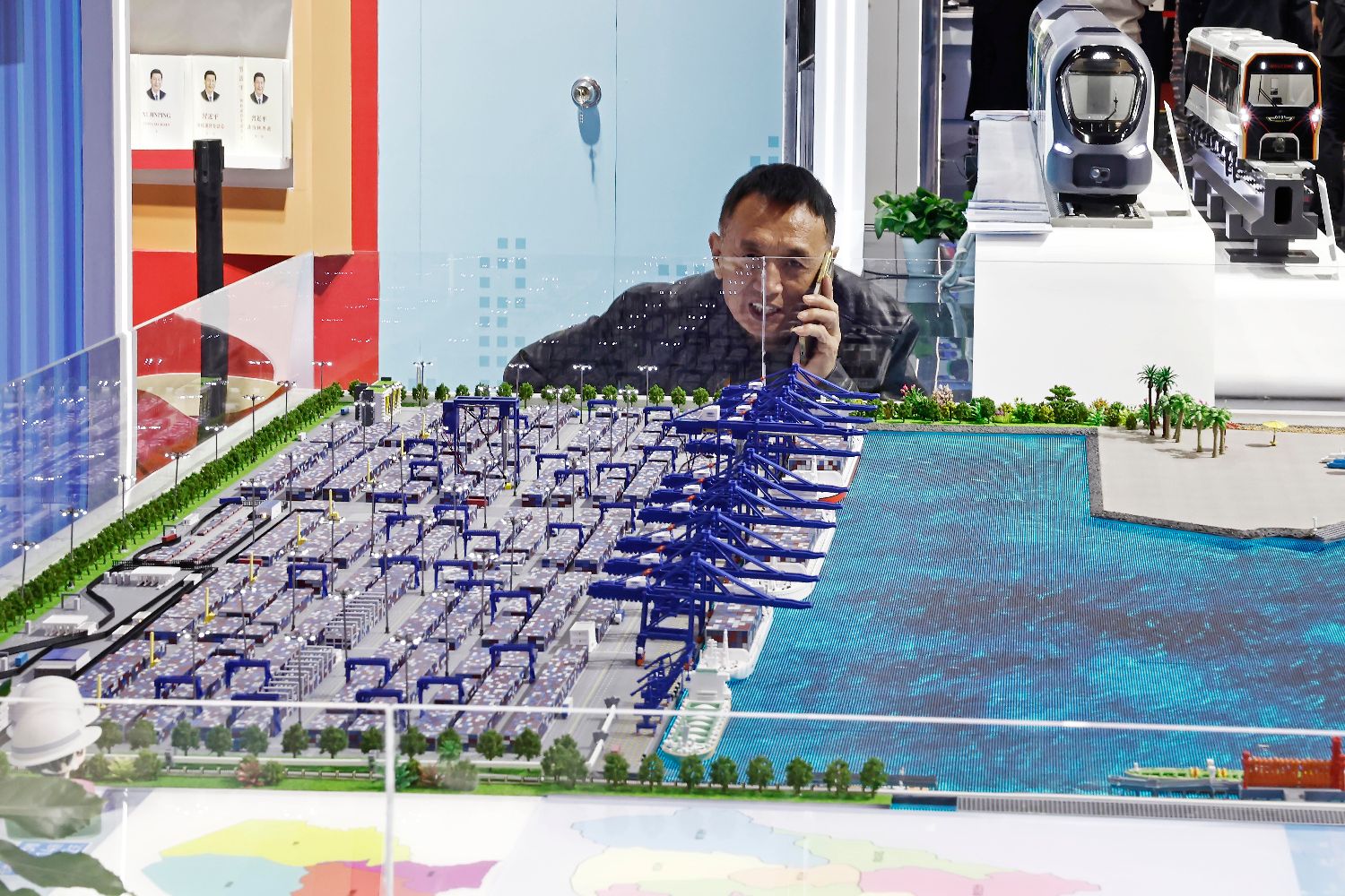 11月6日,观众在第八届进博会国家展中国馆观看装备模型。据悉,在本届进博会上,中国馆展示中国“十四五”期间全面深化改革、推进高水平开放的最新成就,众多科技成果尤为引人瞩目。(图片来源:本文图片均自中新社)