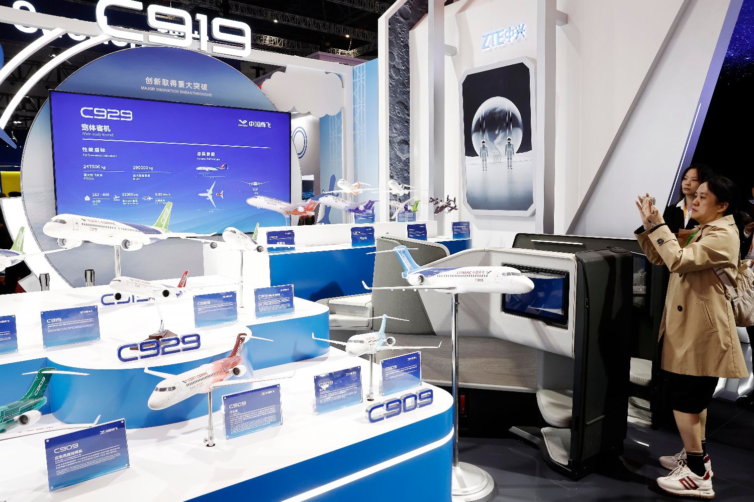 11月6日,观众在第八届进博会国家展中国馆拍摄中国商飞C909、C919、C929客机模型。