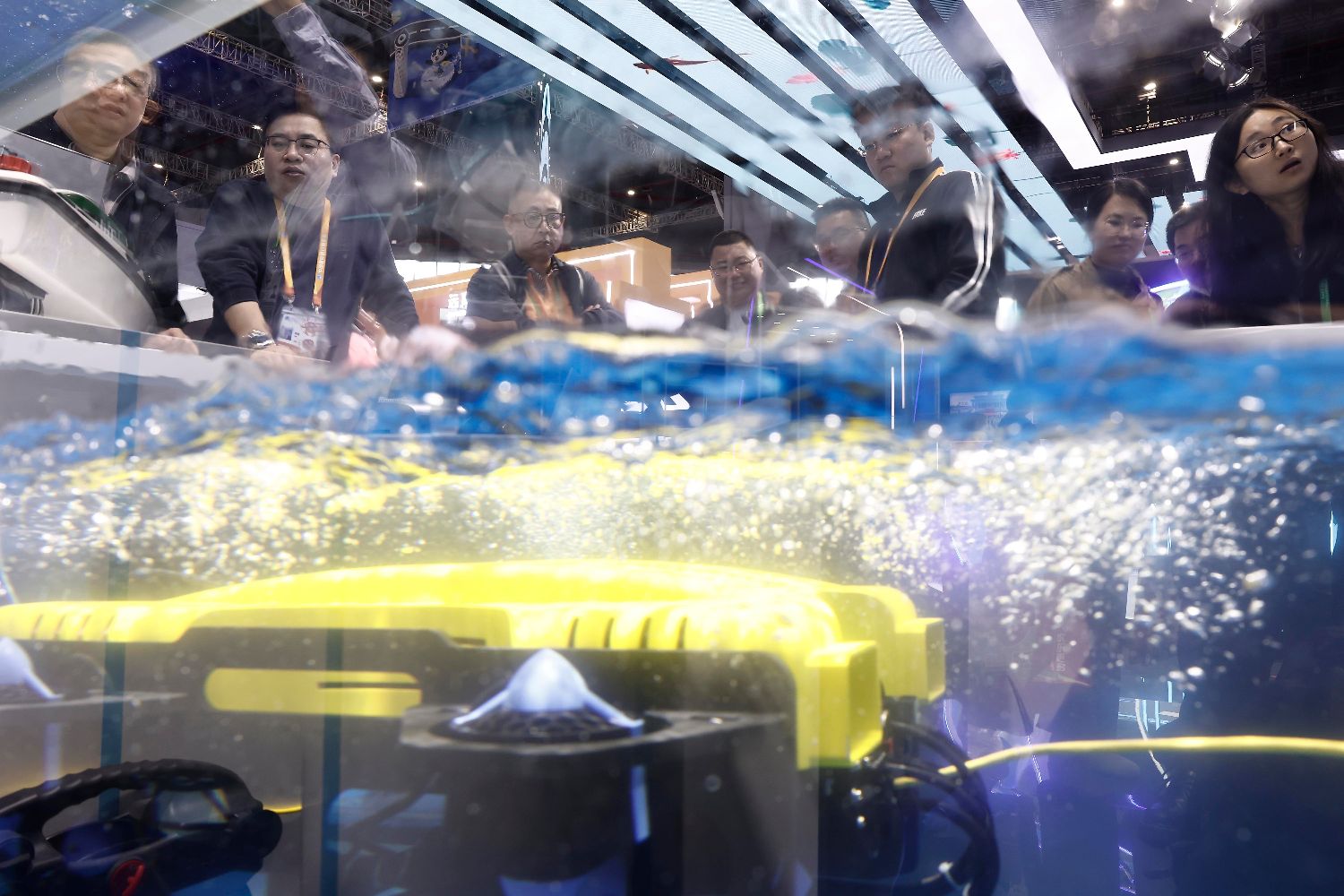 11月6日,观众在第八届进博会国家展中国馆观看人工智能海洋装备演示。