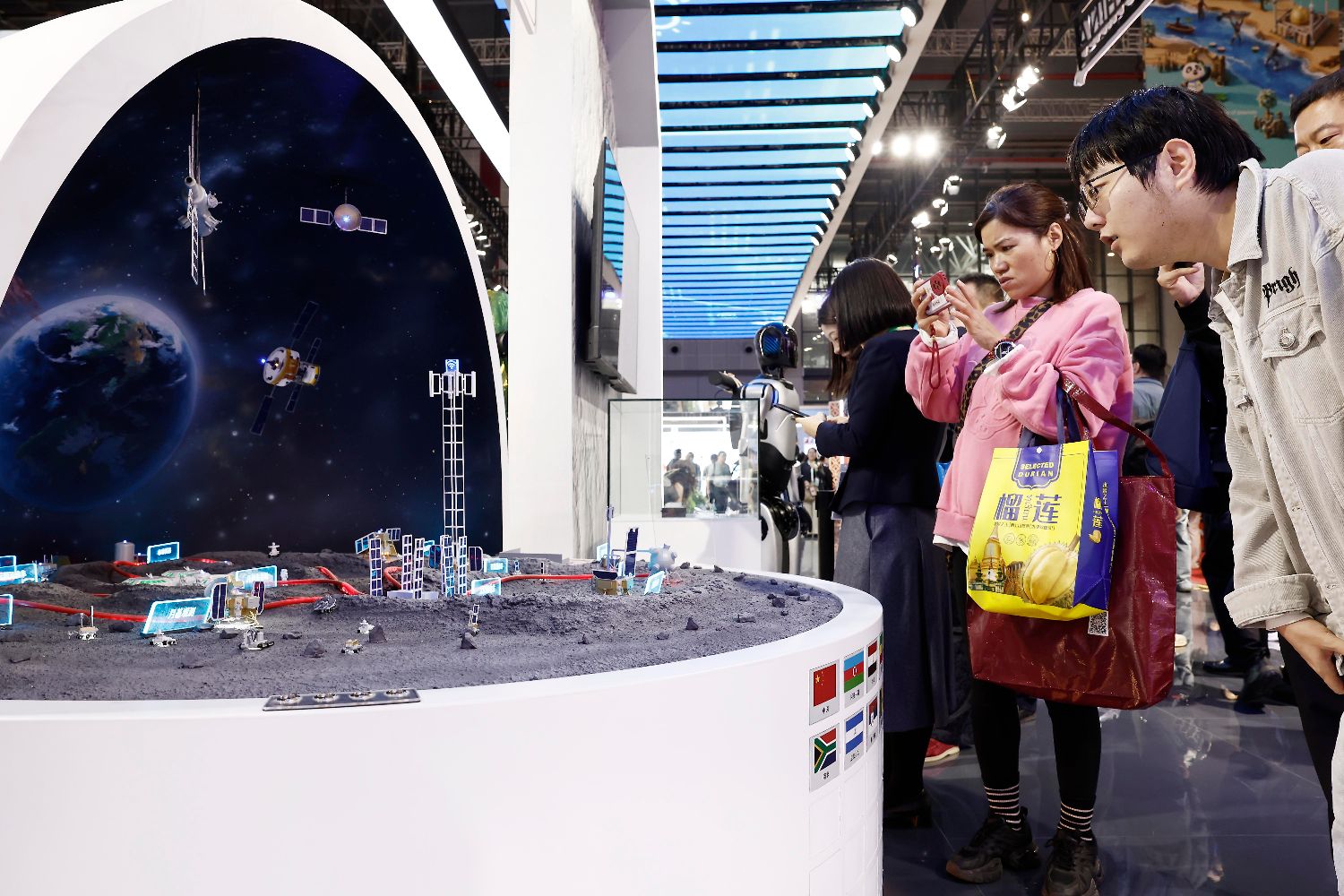11月6日,观众在第八届进博会国家展中国馆观看中国探月工程月球科研站沙盘。