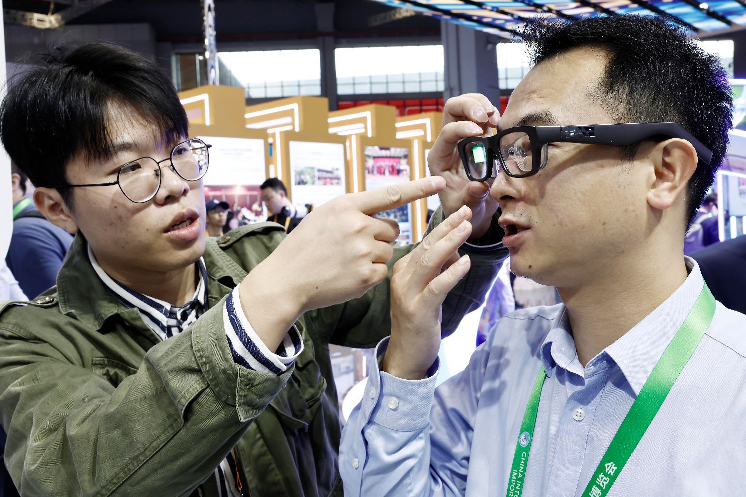 11月6日,观众在第八届进博会国家展中国馆体验同传翻译眼镜。