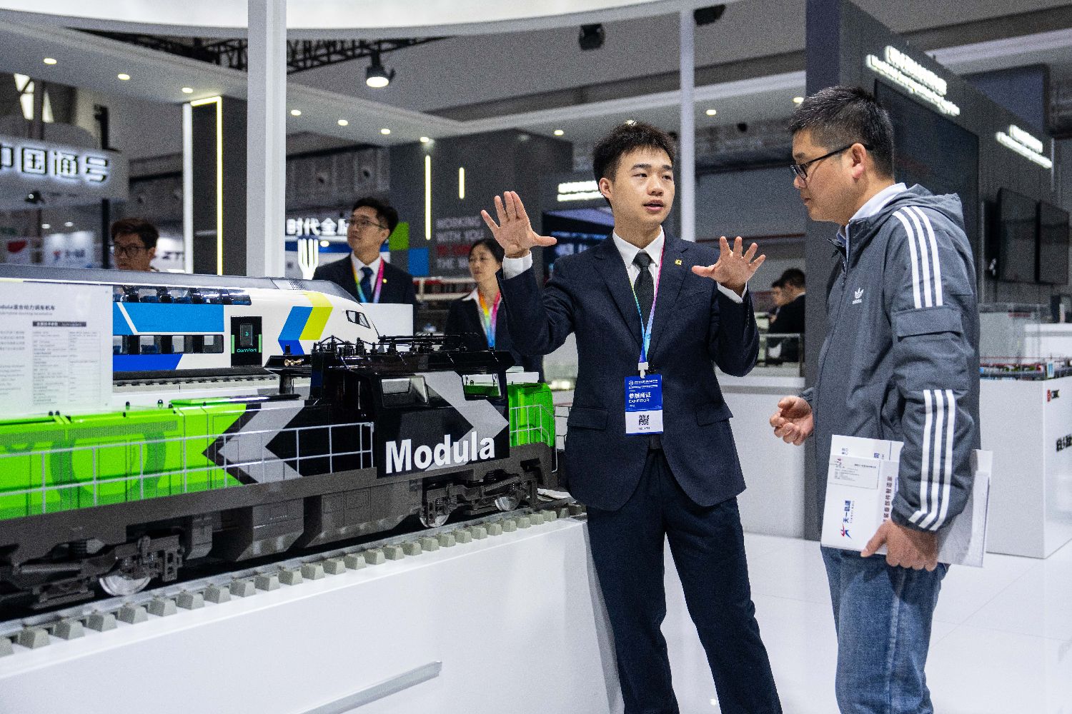 本届轨博会以“轨道联世界 磁浮通未来”为主题,共设置五大主题展区,布展面积近4万平方米,覆盖轨道交通装备制造、关键零部件及原材料、前沿技术示范、智能化系统、运营维护及基础设施设计咨询等全产业链领域,集中展示了磁浮技术等尖端成果,并将发布轨道交通装备系列新产品、新技术、新标准。图为11月7日,工作人员(左)在株洲国际会展中心为观众介绍一款混合动力机车。