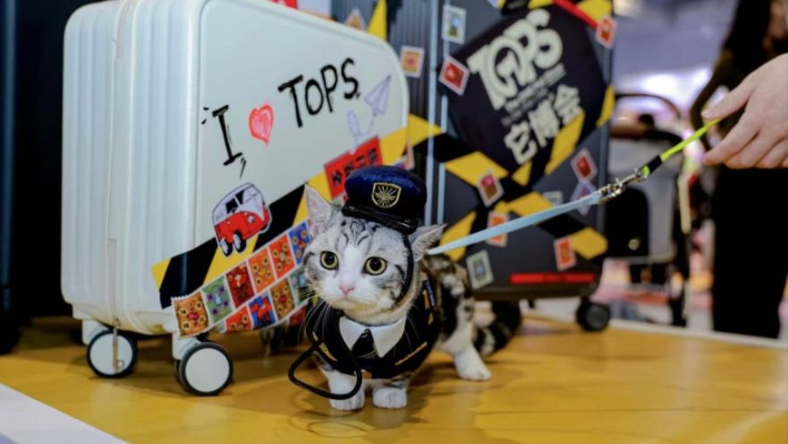第八届进博会首设的宠物主题展区——“它博萌爪航站楼”8日迎来了一位特殊的“客人”。萌趣可爱的美短起司猫“坦克”,在主人的带领下,担任“一日机长”,吸引不少现场观众合影互动。