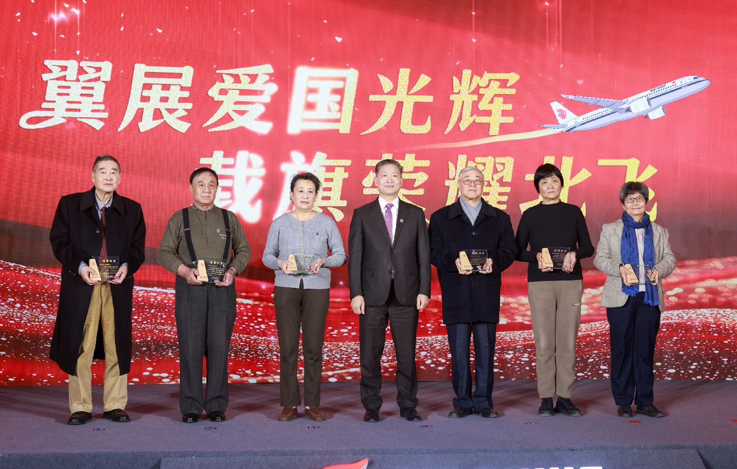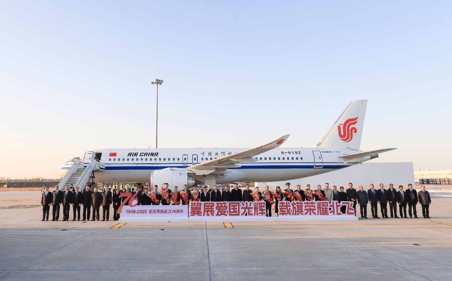 11月9日下午,国航C919飞机平稳降落在天津滨海国际机场后,嘉宾和机组成员合影留念。当日,正值“两航起义”76周年纪念日,国航CA104航班从香港起飞,奔向天津,重飞76年前“两航起义”北飞航线,追溯新中国民航事业的开端,致敬“两航起义”的爱国壮举。