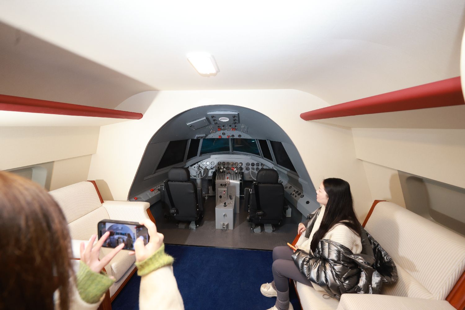 11月10日,观众在位于天津的两航起义展馆内参观参与起义的“北京号”机舱复原内景。