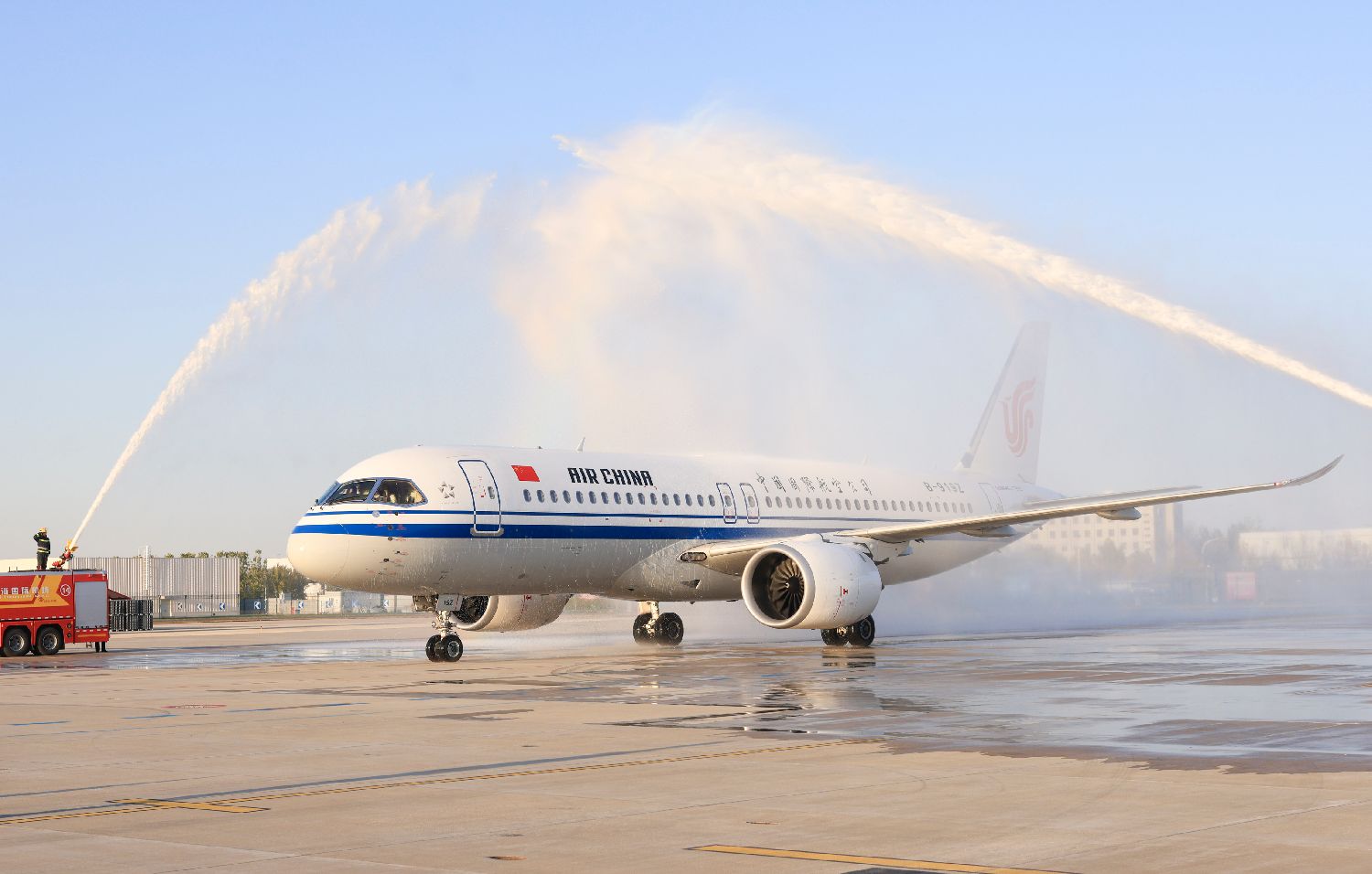 11月9日下午,国航C919飞机平稳降落在天津滨海国际机场后穿过“水门”。