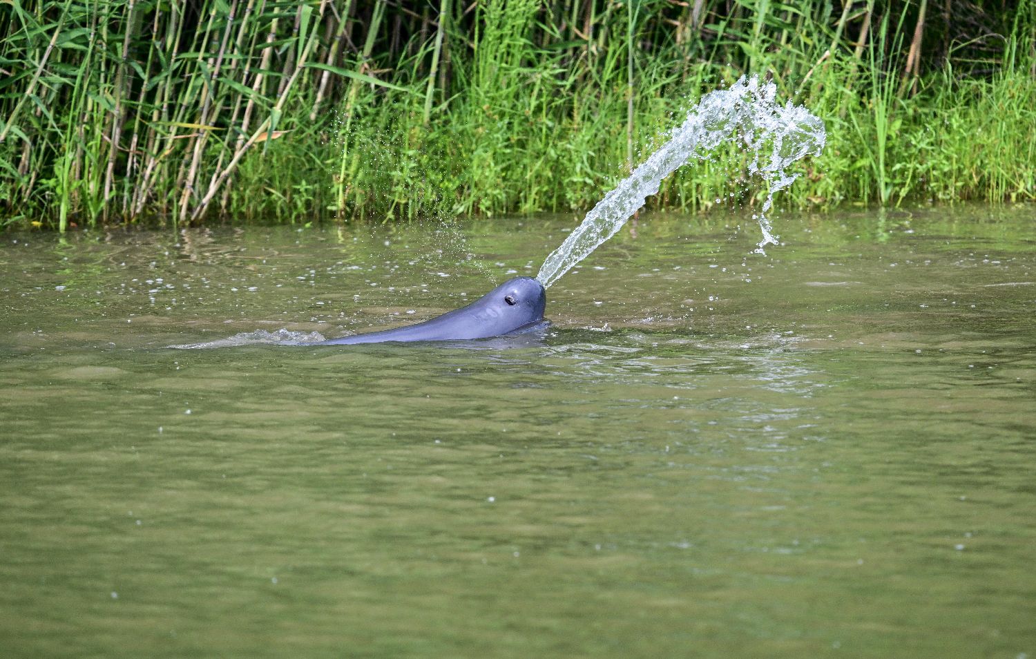一只江豚在江岸边戏水。(图片来源:李博 摄)