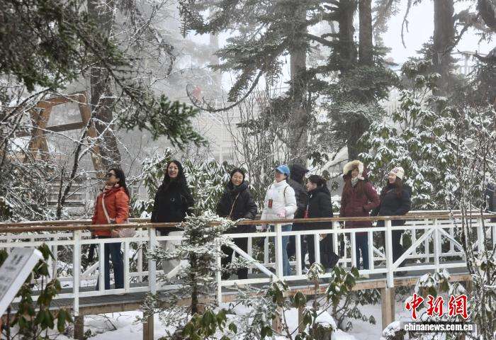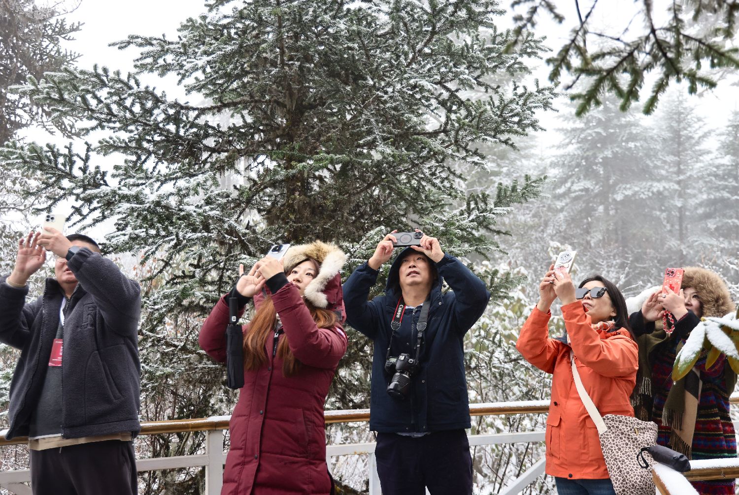 11月12日,2025海外华文媒体甘孜行参访团走进位于四川省甘孜州的海螺沟景区,领略景区的初冬之美。图为海外华媒代表在海螺沟景区一观景台上拍摄。(图片来源:中新网)
