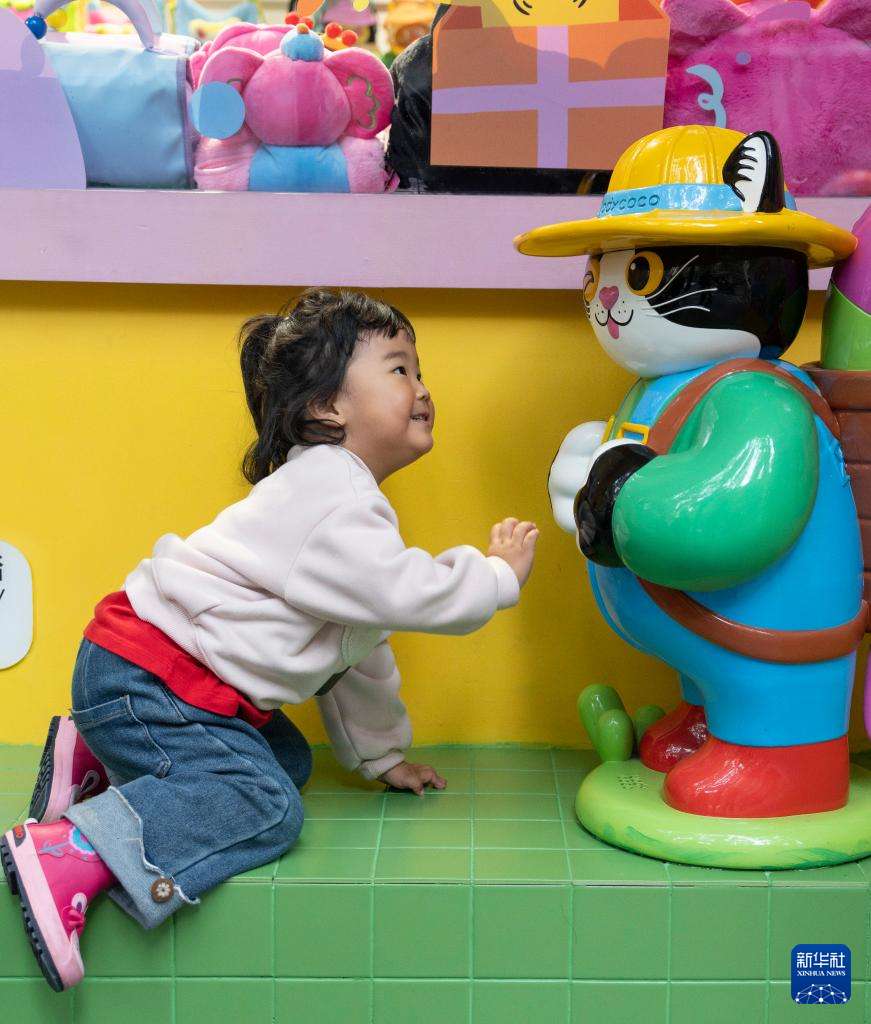 11月12日,在上海市长宁区愚园路的有蒂棵棵网红小店,小朋友与门口的小猫玩偶互动。
