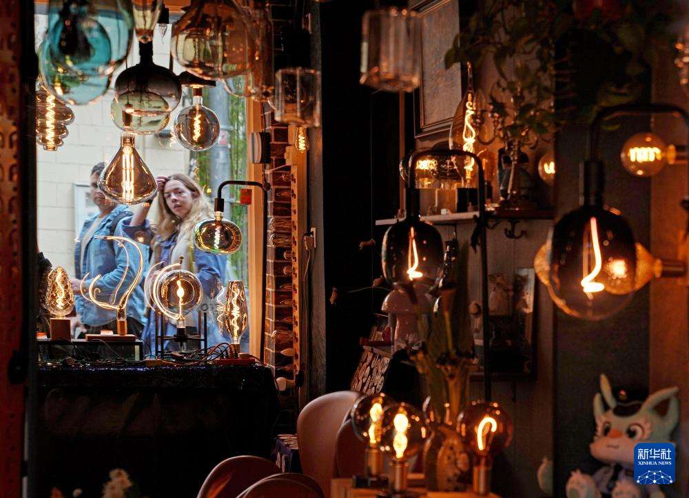 11月12日,行人从上海市长宁区愚园路一家灯具店的橱窗前走过。