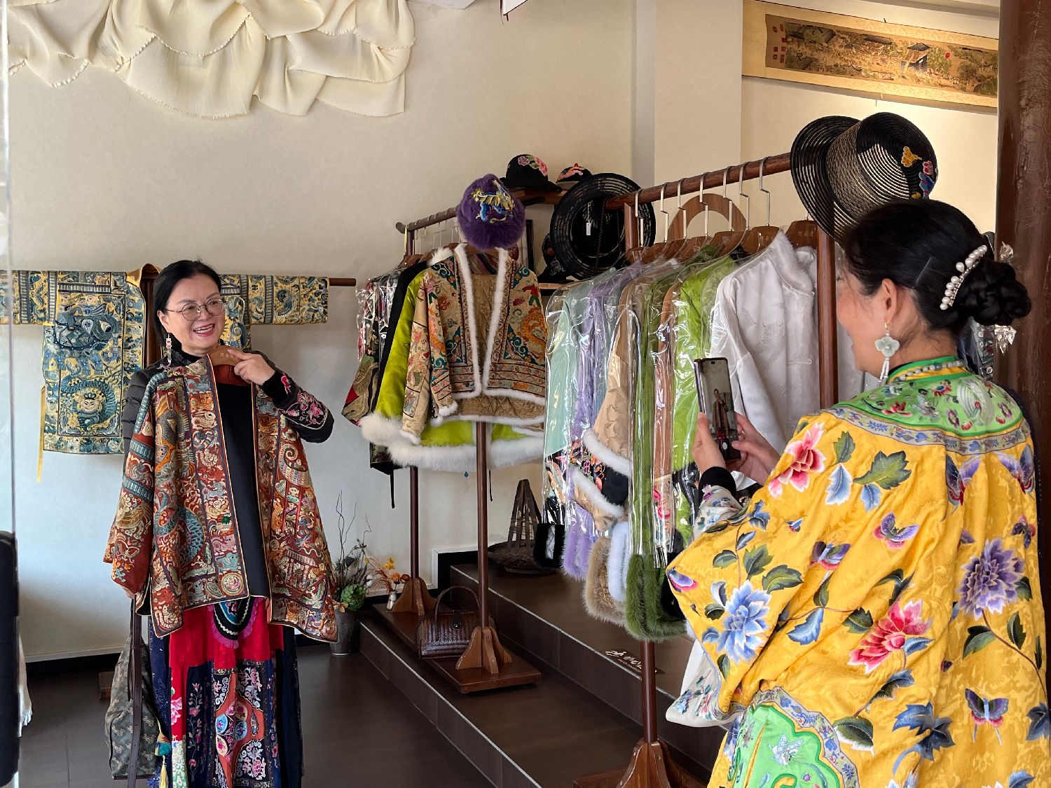 11月15日,贵州凯里,顾客在张理月家的店里挑选苗绣服饰并拍照。(图片来源:中新社)