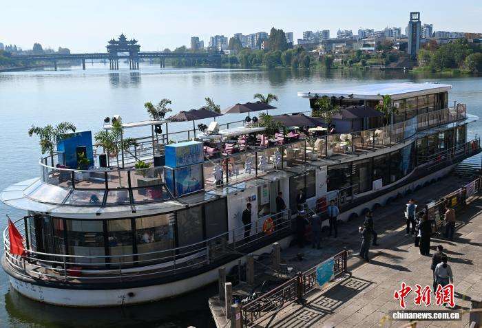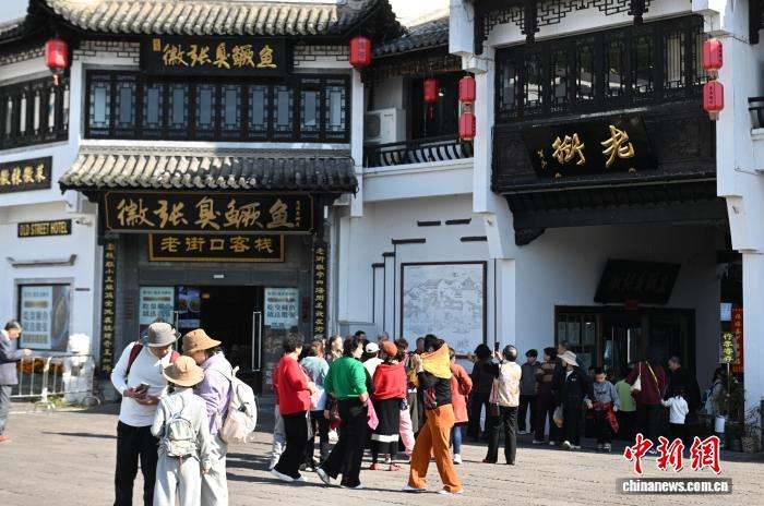 图为位于新安江畔的屯溪老街,吸引了众多游客前来观光。