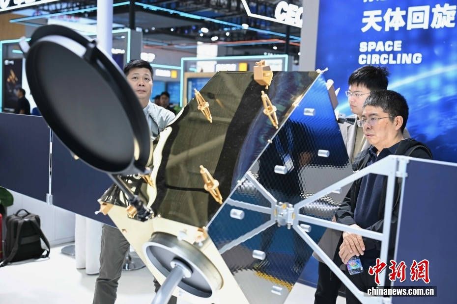 苍宇天基服务系统可为全球低轨卫星、火箭发射、无人机用户提供测控和数据传输服务。图为苍宇一号卫星模型展示。